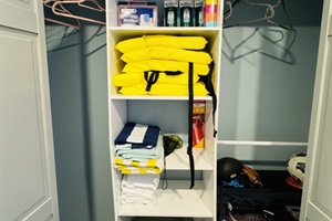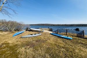 Main floor: has a bedroom with a queen bed, full bathroom, open kitchen and living room with beautiful views of the lake, and access to the deck with propane grill and outdoor dining furniture.